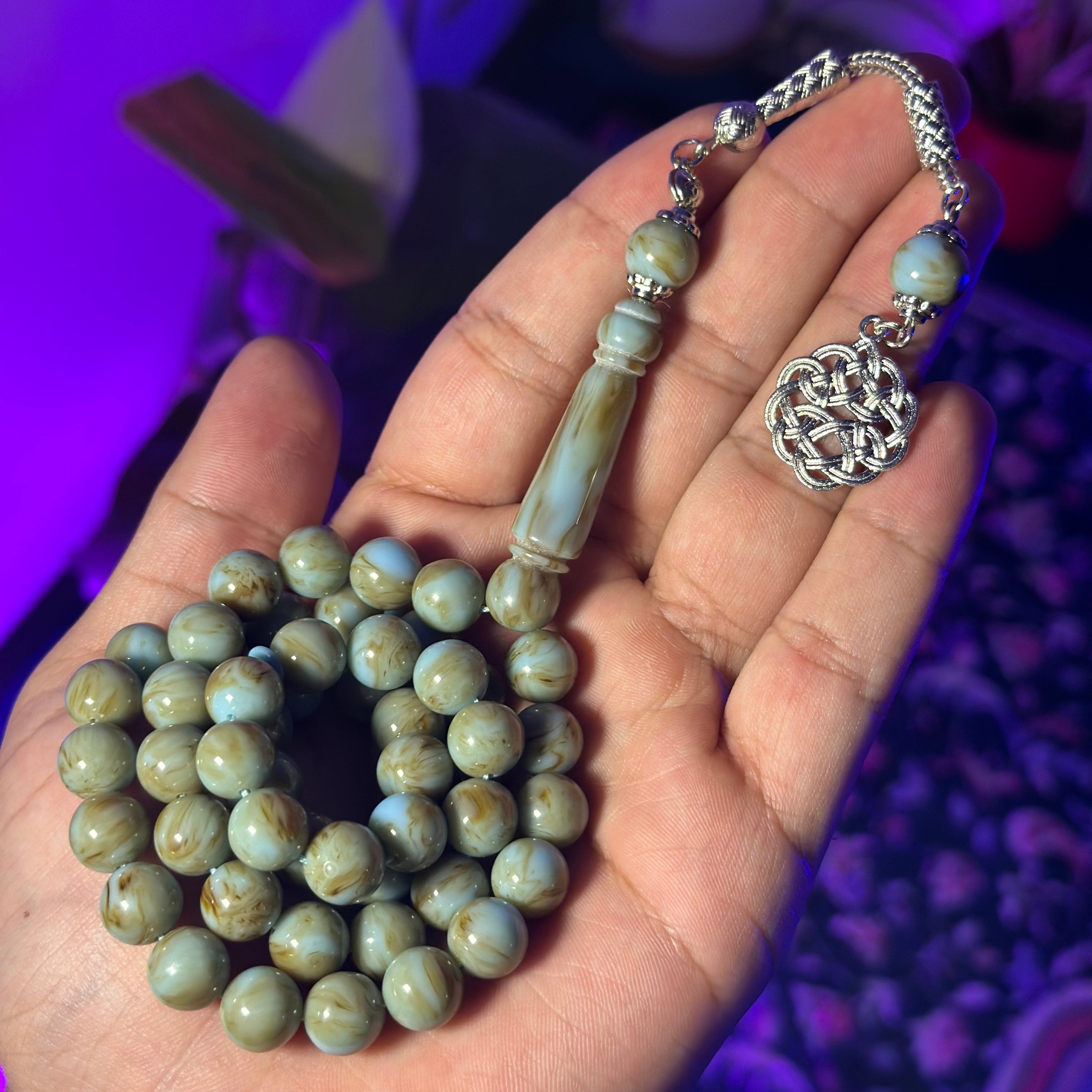 مسباح البكلايت خفيفة الوزن مصممة للاستخدام اليومي، تتميز بتصميم مريح وأنيق، عليها طربزونة ستيل مما يعطي السبحة جمال وفخامة.